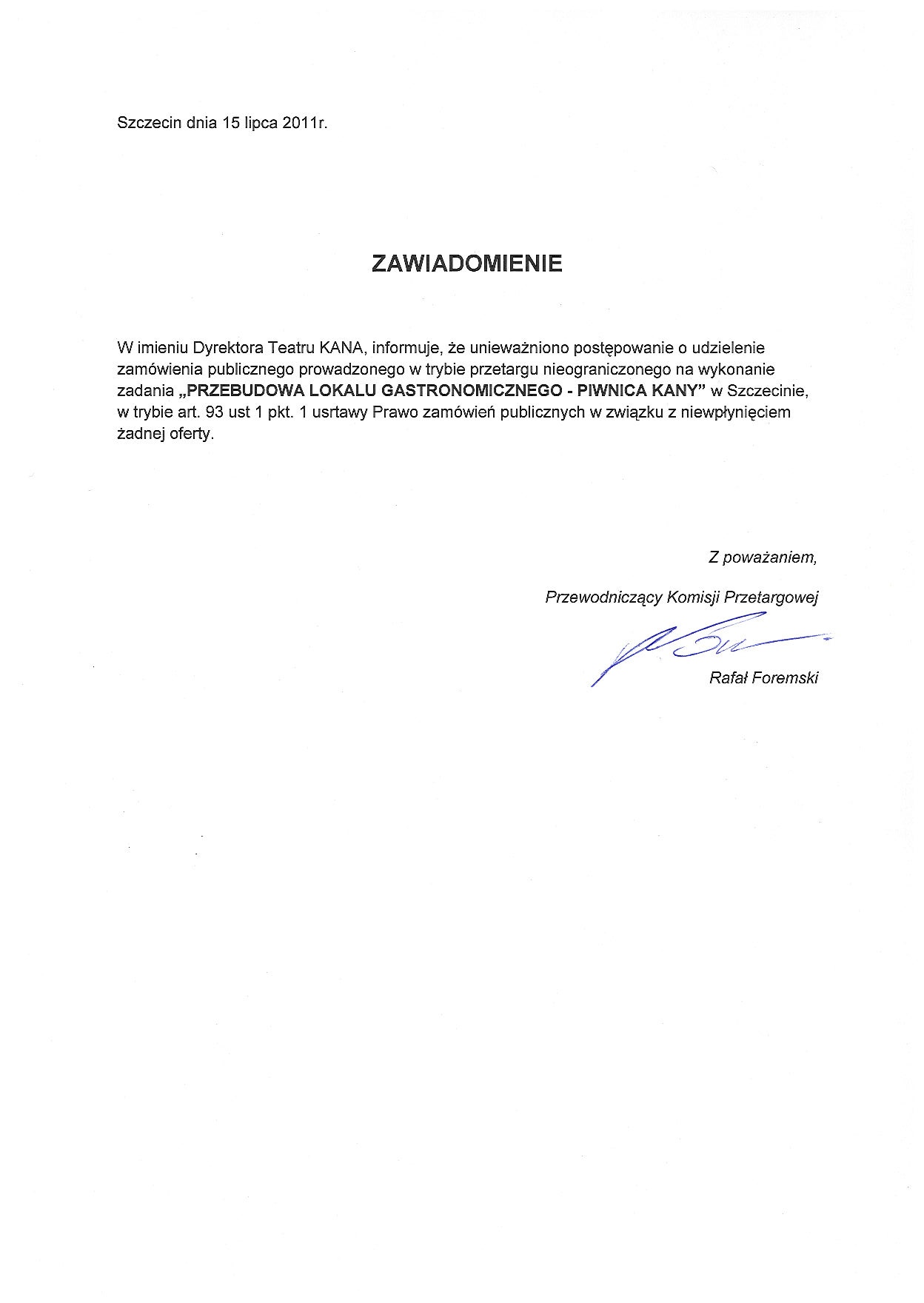 W imieniu Dyrektora Teatru KANA, informuję, że unieważniono postępowanie o udzielenie zamówienia publicznego prowadzonego w trybie przetargu nieograniczonego na wykonanie zadania „PRZEBUDOWA LOKALU GASTRONOMICZNEGO - PIWNICA KANY” w Szczecinie, w trybie art. 93 ust 1 pkt. 1 ustawy Prawo zamówień publicznych w związku z niewpłynięciem żadnej oferty.